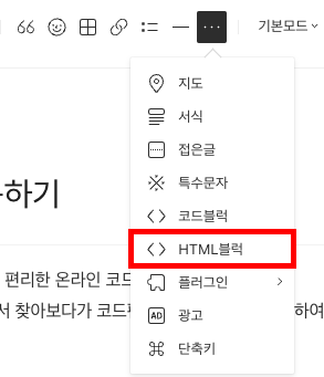 이제 티스토리로 돌아와서, 글쓰기 에디터 오른쪽 상단 기능버튼 중 HTML블럭을 선택하고, 입력창에 위에서 카피한 코드를 붙여넣기 하면 된다.